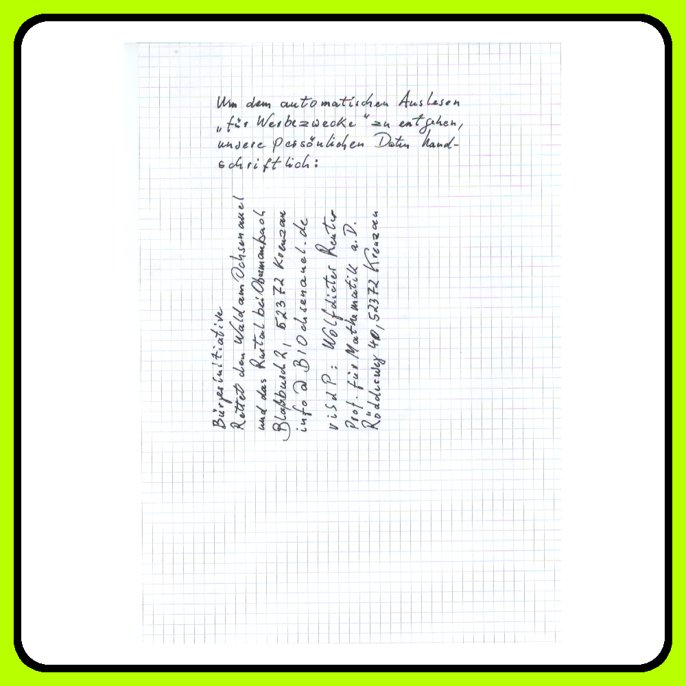 Die Verwendung der Kontaktdaten unseres Impressums zur gewerblichen Werbung ist ausdrücklich nicht erwünscht, es sei denn wir hatten zuvor unsere schriftliche Einwilligung erteilt oder es besteht bereits eine Geschäftsbeziehung.